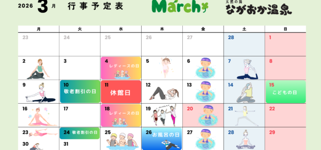 新着・イベント情報 桜祭り回数券キャンペーン 2026.02.26 新着【ながおか温泉】 期間 3/1(日)~3/31(火) 大人(子供)回数券が(8500円・4250円) お値段そのまま &nb 【続きを読む】 春の短期水泳教室 2026.02.26 イベント【ながおか温泉】 期間 3月30日(月)~4月1日(水) 〇時間 16:30~18:00(体操 16:30~) 【続きを読む】 2月子供水泳教室【予約番号・空き状況】 2026.02.05 イベント【ながおか温泉】新着【スイミング教室】新着情報 子供水泳教室【予約番号・空き状況】 【続きを読む】 2月レディースの日 2026.01.19 新着【ながおか温泉】 レディース日は 2月4日(水)・2月25日(水) 【続きを読む】