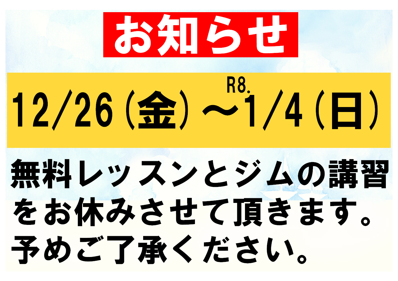 12月無料レッスン・ジム講習お休みのお知らせ 2025年11月27日 お知らせ 12月26日(金)~令和8年1月4日(日) 無料レッスンとジムの講習をお休みさせていただきます ご理解、ご協力の程よろしくお願いします。 « ボーナスセール回数券キャンペーン ながおか温泉【25周年記念企画創業祭】 »