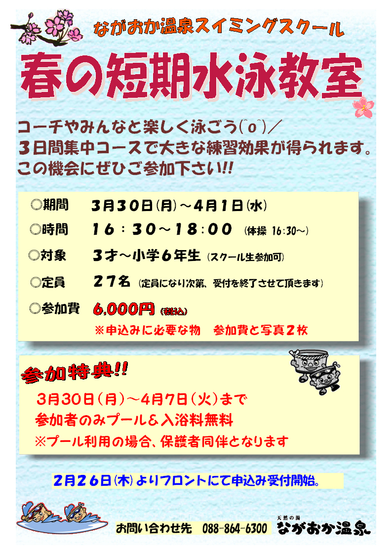 春の短期水泳教室 2026年2月26日 期間 3月30日(月)~4月1日(水) 〇時間 16:30~18:00(体操 16:30~) 〇対象 3才~小学6年生(スクール生参加可) 〇定員 27名(定員になり次第、受付を終了させて頂きます) 〇参加費 6,000円(税込) ※申込みに必要な物、参加費と写真2枚 参加特典!! 3月30日(月)~4月7日(火)まで参加者のみプール&入浴料無料!! ※プール利用の場合、保護者同伴となります 2月26日(木)よりフロントにて申込み受付開始!! お問い合わせ先 088-864-6300 « 2月子供水泳教室【予約番号・空き状況】 桜祭り回数券キャンペーン »